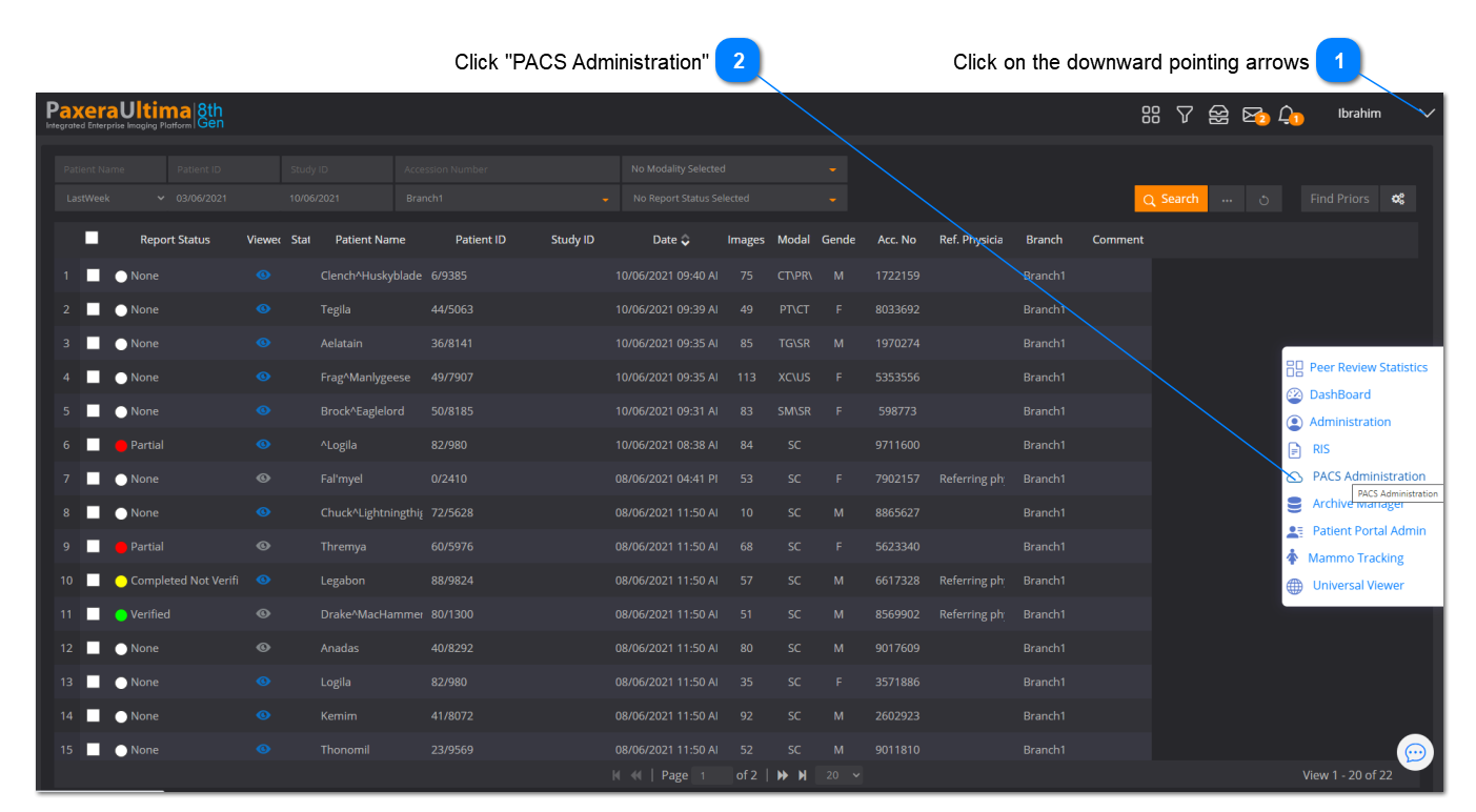 1. Click on the ‘ Arrow ’ button located in the top right corner of the worklist screen, and then click on ‘PACS administration’: