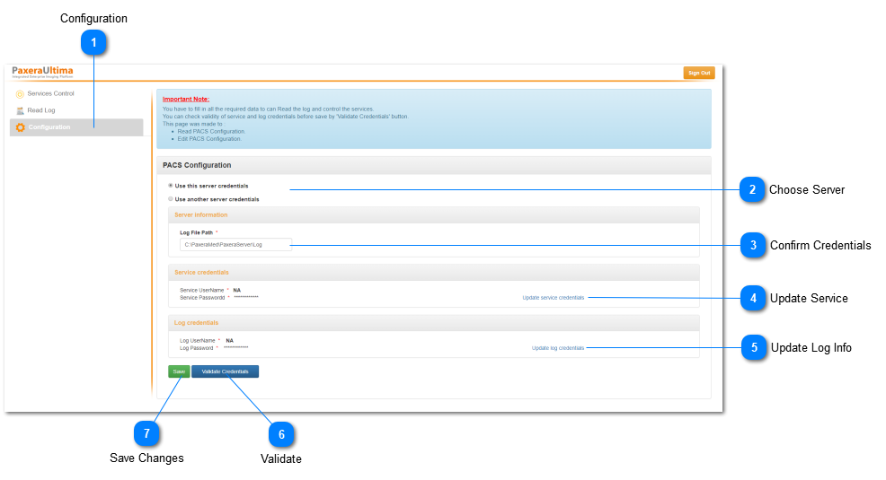 The user needs to ensure that the PACS has been configured successfully before any service, control, or log information can be accessed. Instructions for the configuration and use of the PACs admin are given below.