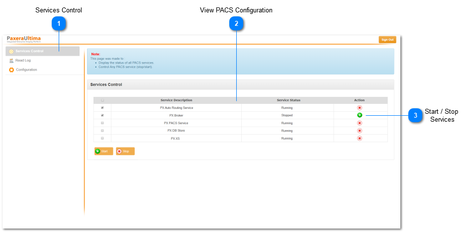 3. Click on the start/stop button to control any of the PACS services.