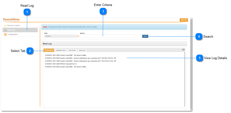 • Read log - to read PACS log files by type and date. This includes DICOM store, database store, auto route, and study info.