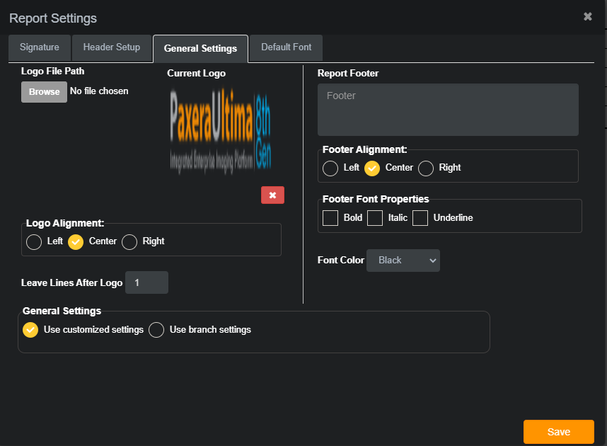General Settings: customize the report logo and footer text. You can also choose which settings (branch-based or customer-based) to be applied.