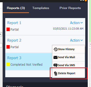 The reports panel enables the user to view, edit, and delete reports. The user can also add a diagnosis, send the report via mail/text message, archive the report, and listen to / record voice notes. An overview of the reports panel is shown below: