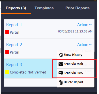 The report needs to be verified in order for it to be sent via SMS. The report needs to be saved before it can be sent via mail