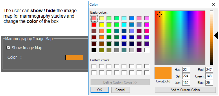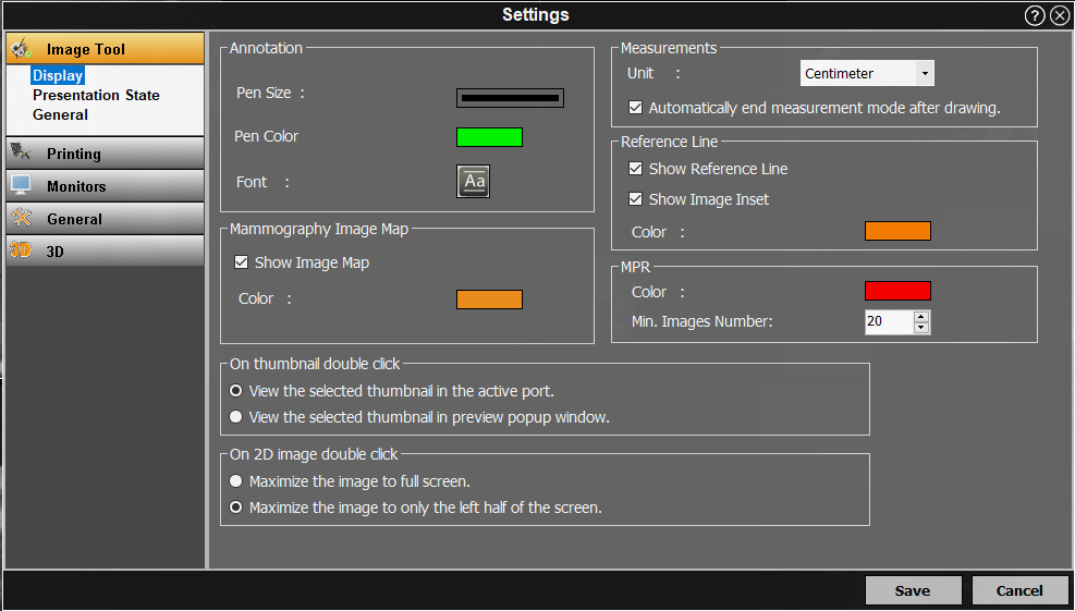 The Display settings is where the user can make adjustments to the annotation tool, measurement tool, reference line, MPR mode, mammography image mapping, window and thumbnail view.