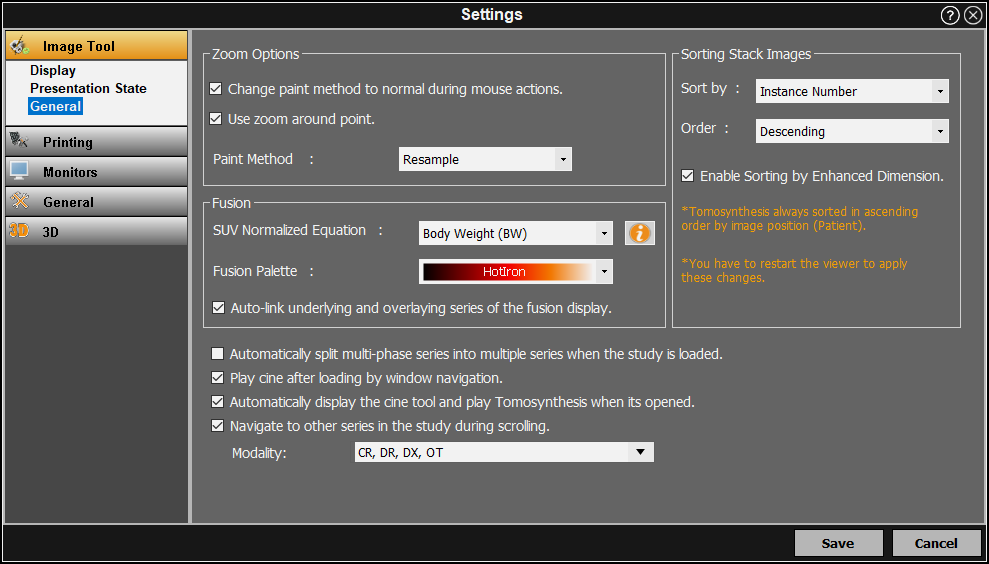 The General settings is where the user can make adjustments to the zoom feature, stacked images, and fusion tool. See below for more information: