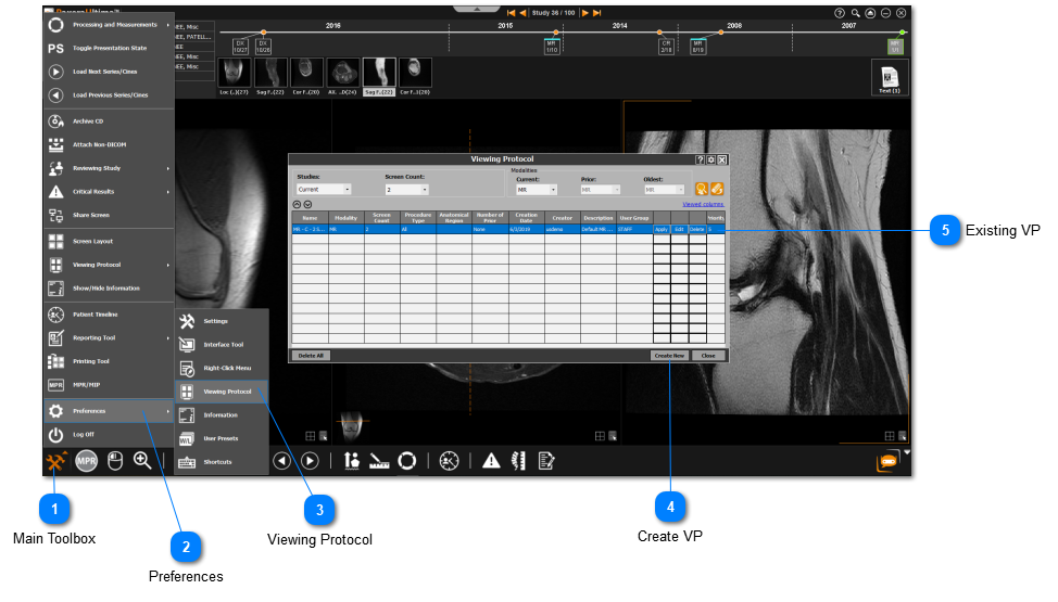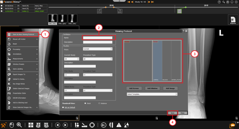 The user can adjust the viewing protocol to the desired format using the 'Screen Layout' tool in the main viewer. Then right-click anywhere on the viewer and select ‘Save As New Viewing Protocol’.