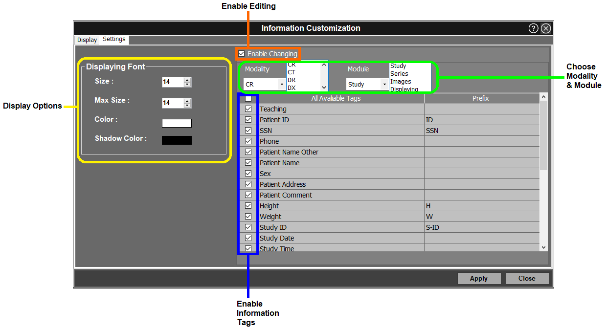 Enable info tags −check off appropriate DICOM tags to be displayed on the outer corners according to each module.