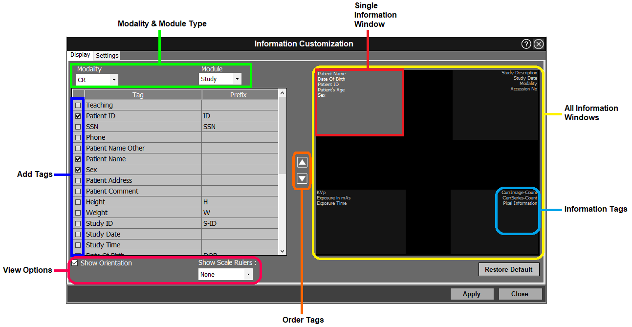 The display tab enables the user to customize all the info displayed on the outer four corners of the image windows for a specific modality and module. You can also rearrange the order of tags.
