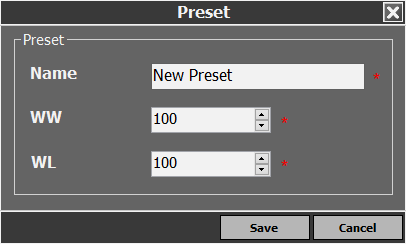 The user presets editor enables the user to customize the window width (WW) and window level (WL) of different tissues in the image. These values represent the brightness and contrast of the image. By default, the window/level tool only affects gray scale images. Adjusting the window width and level on a colored image will change the actual color of the image as opposed to the gray portions.