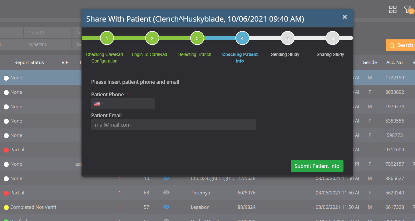 Enter patient's cell phone and email, then press "Submit Patient Info" to start sending the study to CareRad and send a text message and email to the patient regarding the study being shared.