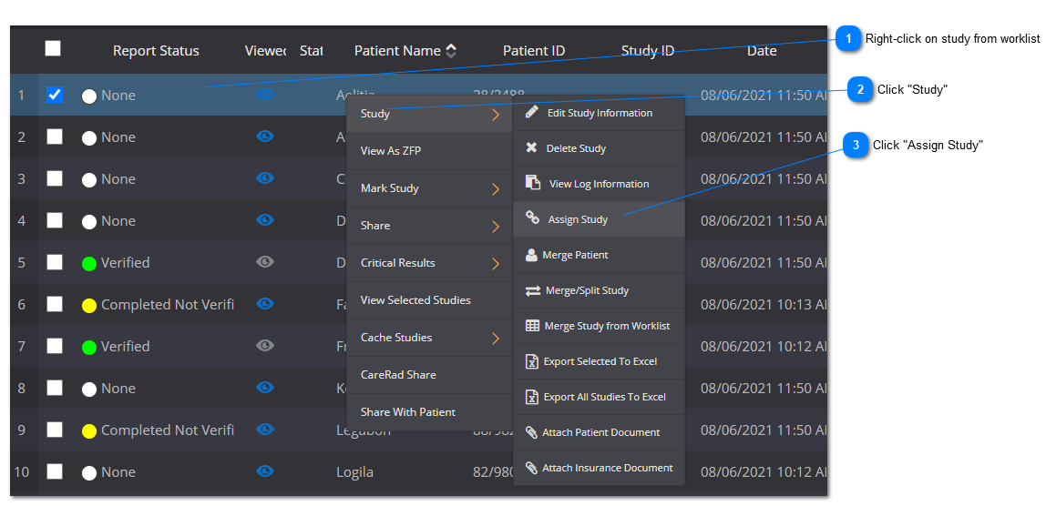 This feature enables the user to assign a study to another user to review and/or write a report for. To assign a study to another user, follow the steps below: