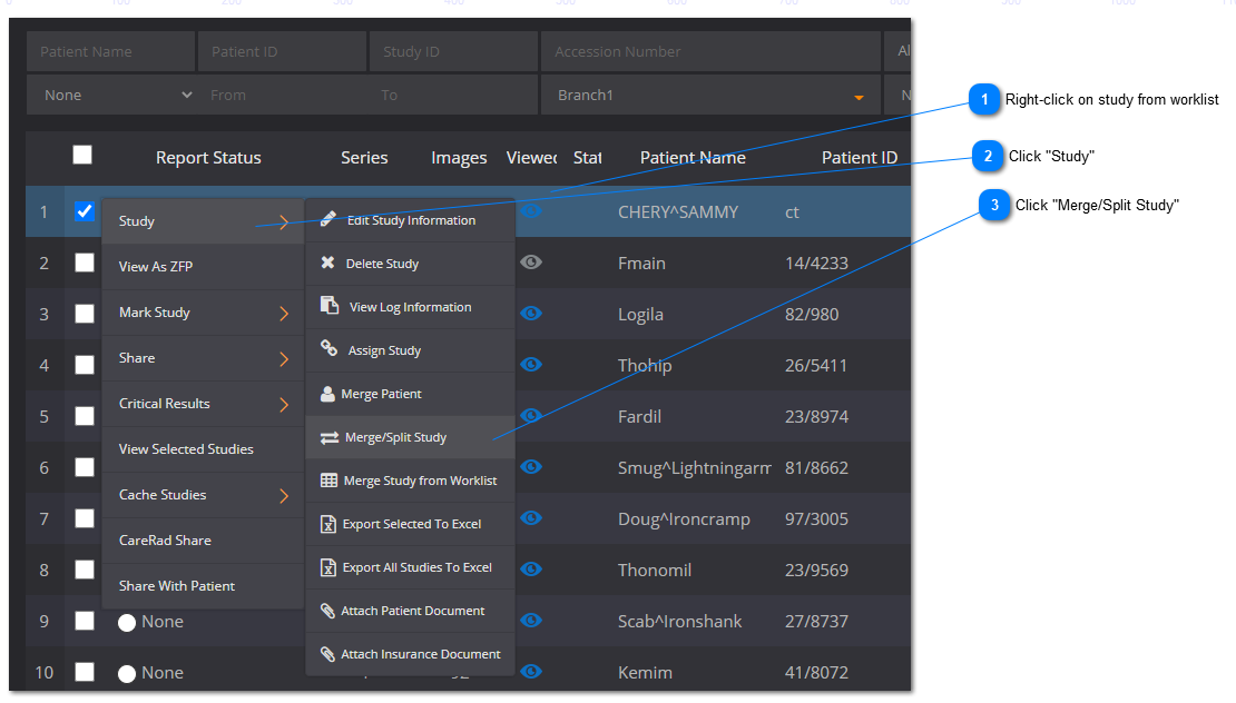 This feature enables the user to split a single study into 2 studies. It is most often used if you took two different body parts in one study and want to seperate the study into two.