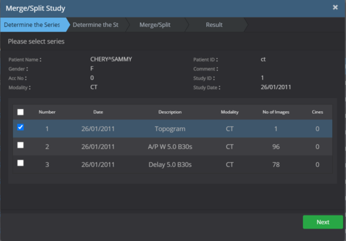 A new window will appear with the patient study that was selected to be merged, select all series to be placed into the new study and click 'Next'