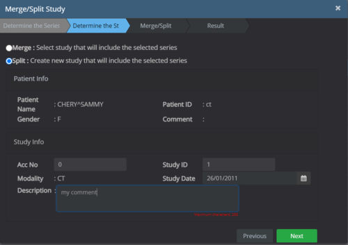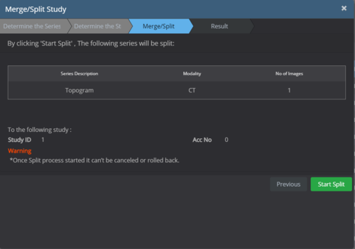 Select the "Split" option and then enter the required accession number / Study ID / Description for the new study that will be split off, then click 'Next' :