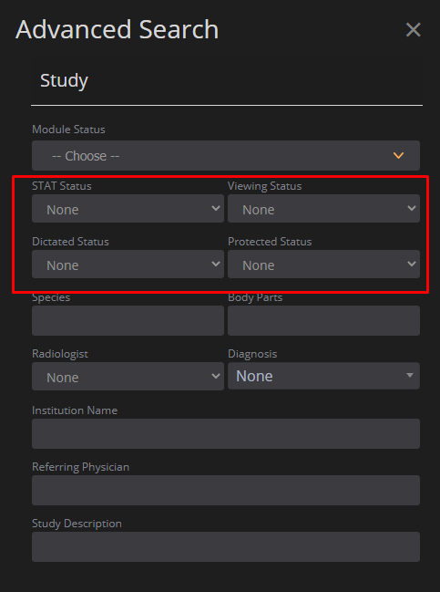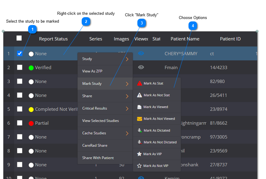 This feature enables the user to mark the study as: stat/not stat; viewed/not viewed; and dictated/not dictated.