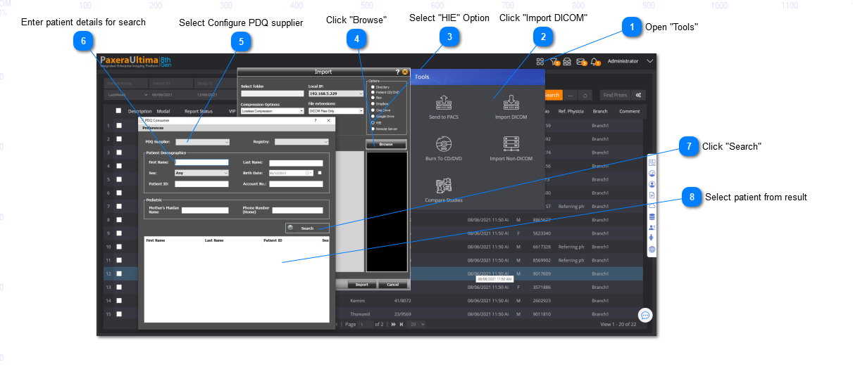 To import studies from the Health Information Exchange Platform (connected to PDQ supplier / Registry), simply follow the steps below: