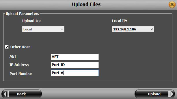 The Upload Parameters window will appear. The user has an option to upload to a local IP, or to another DICOM node: