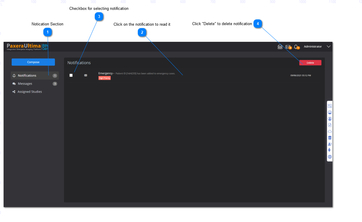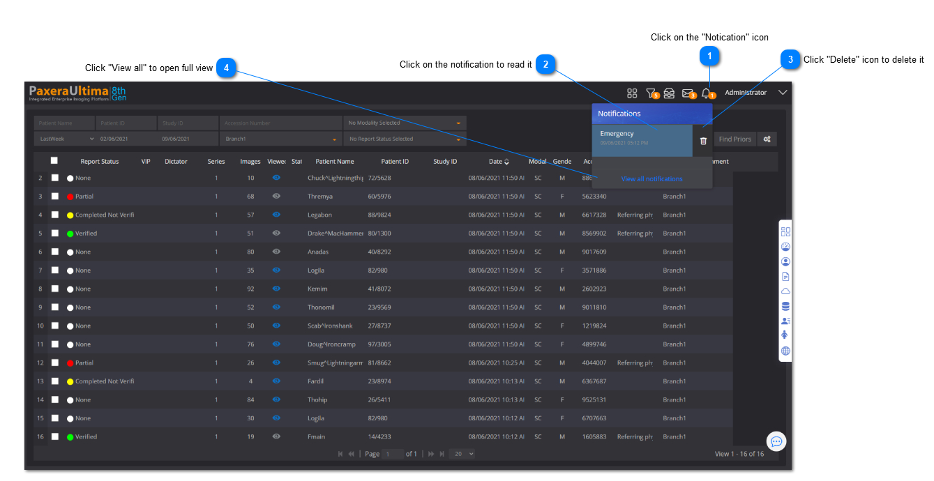 The notifications feature contains all alerts for the status of peer review studies, discrepancy studies, critical results, and other workflow managementment tools.