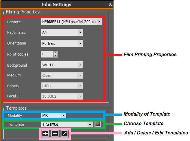 The film settings are used to choose a printer and to select the paper/film size, orientation, copies and priorities.