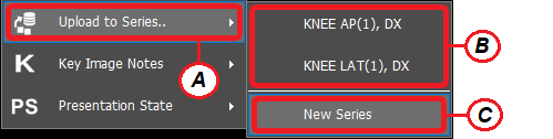 A dropdown menu will appear, click on ‘Upload to Series’ (A) and then choose either an existing series (B) or a new series (C)