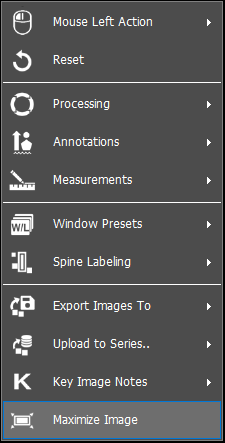 To maximize an image in an image window of the study viewer, simply right click on the image of interest. A dropdown list will appear, select ‘Maximize’, as shown below: