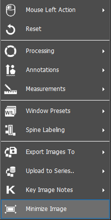 To minimize an image in an image window of the study viewer, simply right click on the image of interest. A dropdown list will appear, select ‘Minimize’, as shown below: