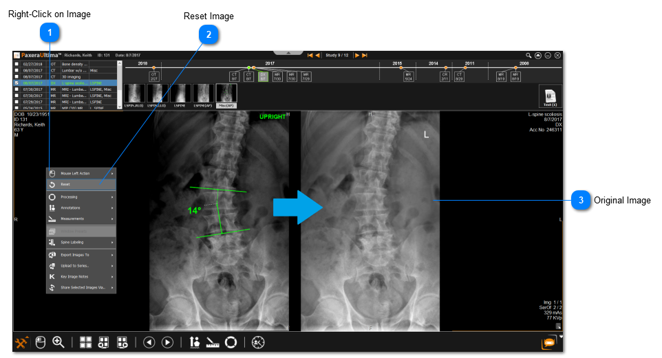 From the study viewer, simply right click on the image to be reset. A dropdown menu will appear, click on ‘Reset’.