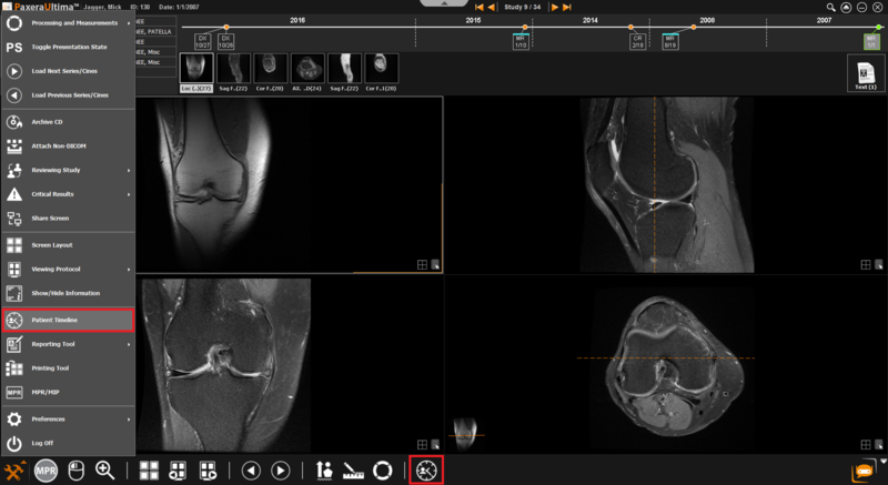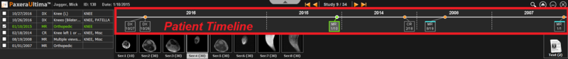 In this section the user will learn about the patient timeline feature. The patient timeline is used to view the history of images acquired from the patient; shown by a timeline that indicates all the patients past studies, along with study dates and modality.