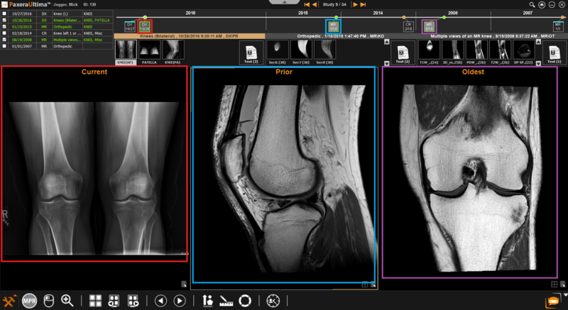 » Each block in the patient timeline panel indicates a study and contains the modality and date of the study (i.e. MR, 12/30).