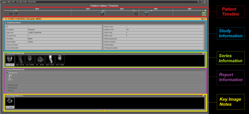 » The basic study information will be shown in the patient timeline window when a study block is opened (see point above), it contains the basic study description along with the series information.