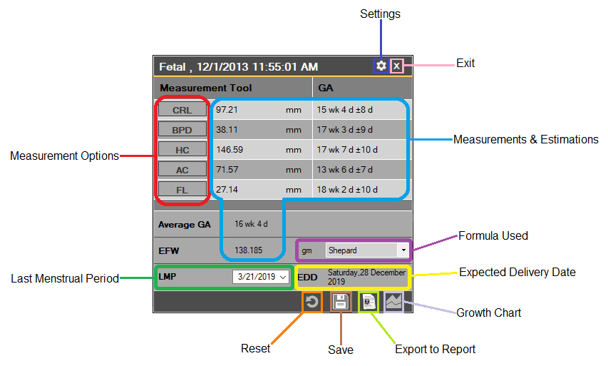 This tool enables the user to take fetal measurements on ultrasound studies including: crown rump length (CRL); bipartial diameter (BPD); head circumference (HC); abdomen circumference (AC); and femur length (FL).