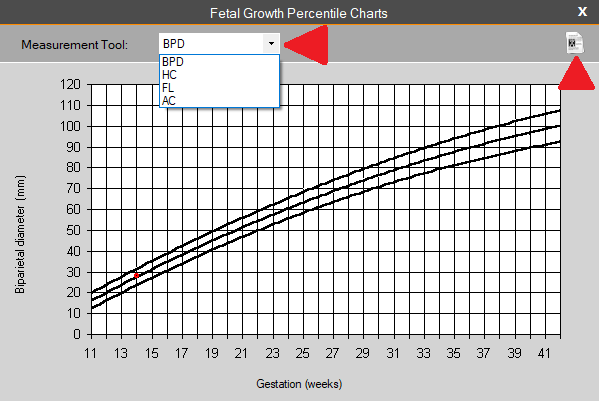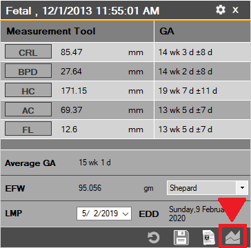 This tool enables the user to view the fetal growth percentile chart and is used to track the growth of the fetus over multiple time points. To access this, simply click on the ‘chart’ button on the bottom right corner of the fetal measurement tool, as shown below: