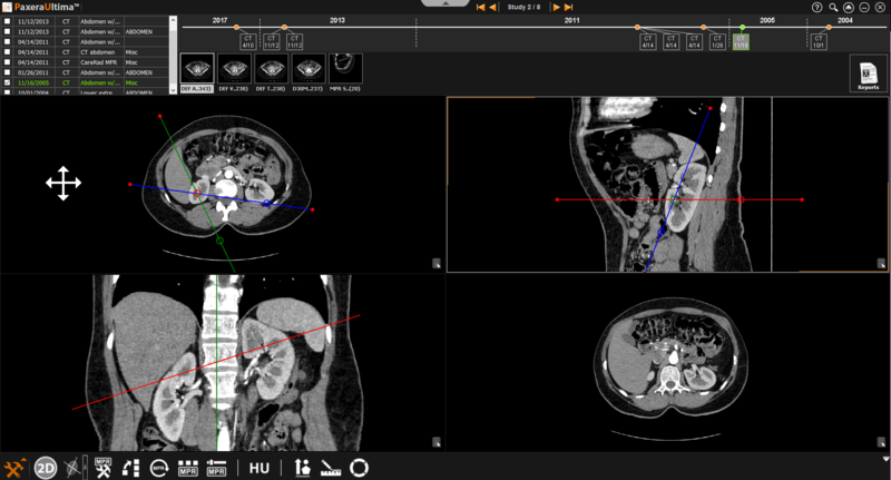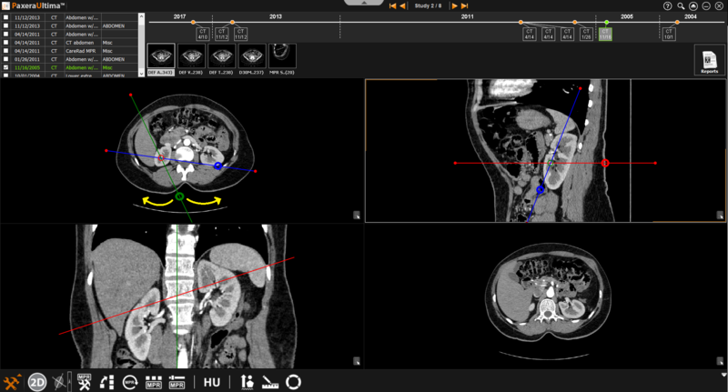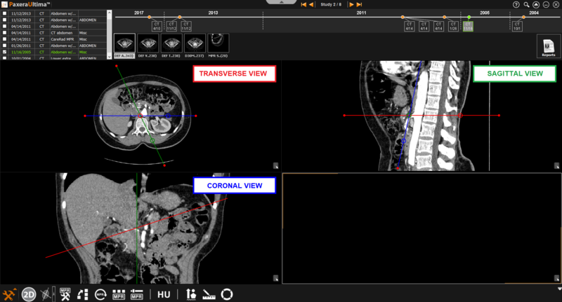 The bioblique MPR mode provides three planes (transverse, sagittal, and coronal) with lines that can rotate the angle of the planes. The image on the bottom right corner can be omitted within the bioblique mode.