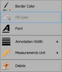 For any measurement conducted or template created, the user can right click on the measurement to access tools to edit the border color; fill color; font; annotation width; measurement unit; or to delete the measurement; as shown below: