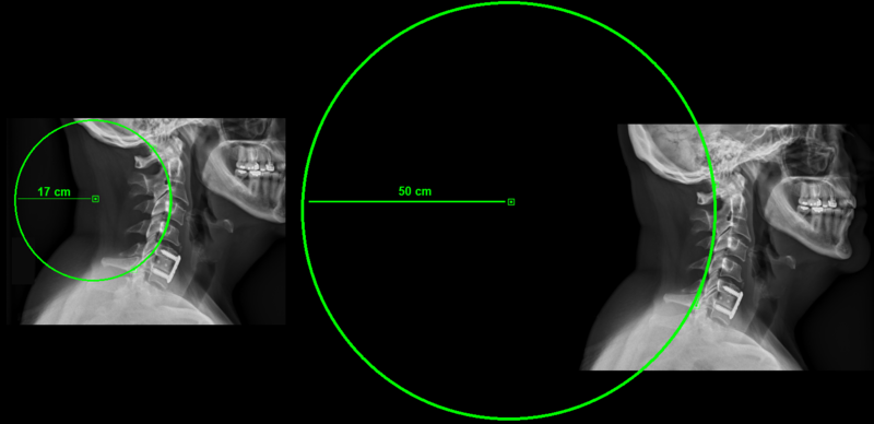 The cervical curve tool is used to draw a curve between two points based on the radius of a circle including those points. Follow the instructions below to use this tool: