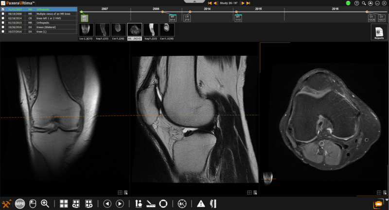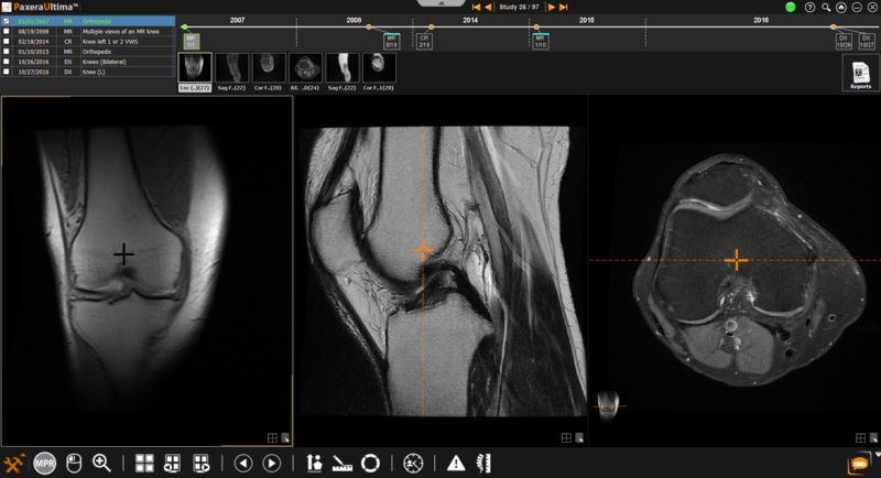 In the example below, the coronal image stays fixed as the mouse is moved along the image. The dotted orange line corresponds to the coronal plane of the fixed image on the sagittal and axial series. The orange cross on both the sagittal and axial series corresponds to the coordinate point on the fixed image. As you move your mouse around the fixed image, you can navigate through the other series while localizing the moving point on your still image.
